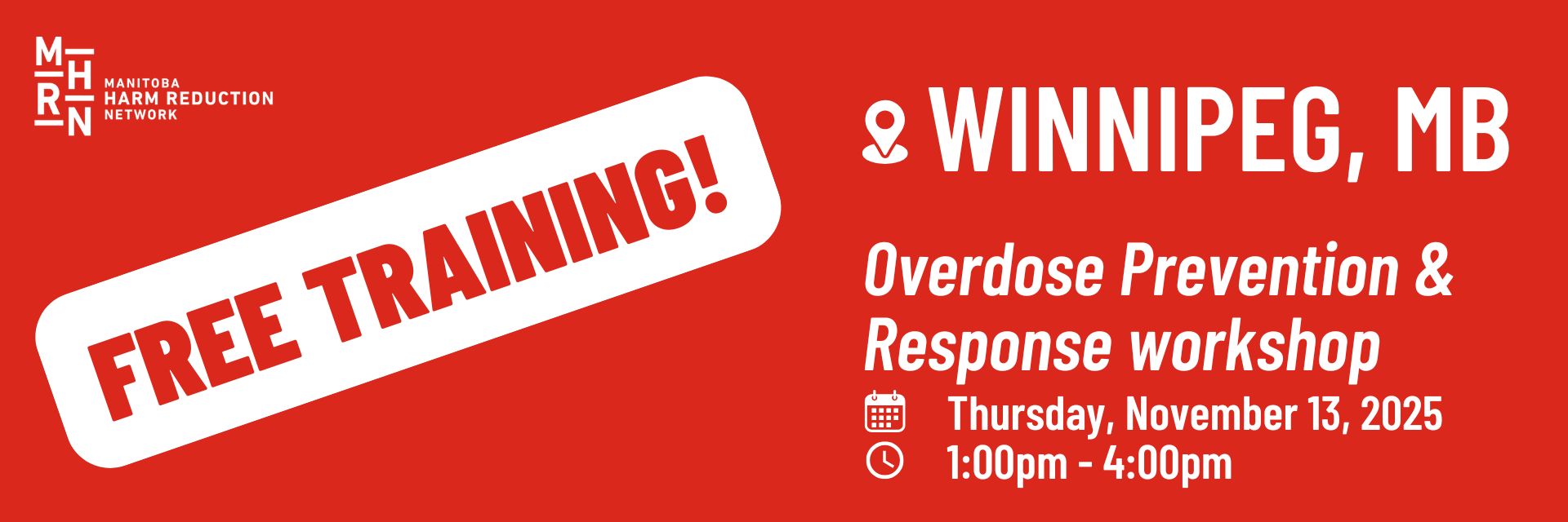 About the Workshop Overdose continues to be a leading cause of preventable death in Manitoba and across Canada. This practical, skills-based training equips participants with the knowledge and tools to prevent, recognize, and respond to overdoses in their communities and workplaces. This session is designed to build confidence and capacity in responding effectively to an overdose situation, while centering harm reduction, dignity, and care.